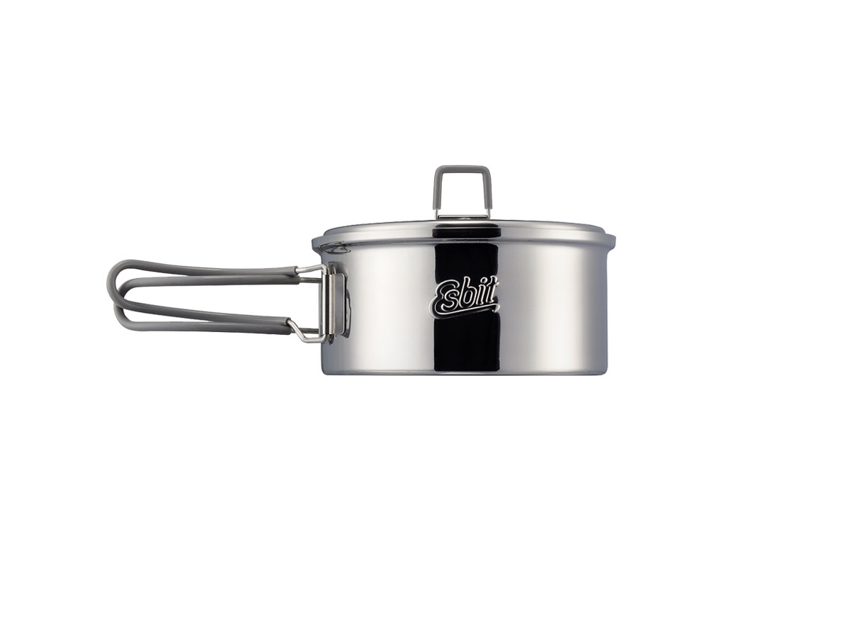 I manici della pentola e del coperchio sono pieghevoli, garantendo così un ingombro minimo. Sono rivestiti in silicone per proteggere dal calore. Un dettaglio speciale sul coperchio rende la cottura ancora più comoda: è dotato di un gancio sul lato inferiore che permette di agganciarlo al bordo della pentola, evitando che si sporchi e lasciandoti le mani libere durante la cottura. Una scala graduata all'interno della pentola indica il volume in ml e oz. La confezione include anche una pratica borsa a rete per tenere la pentola al sicuro durante il trasporto. L'interno della pentola offre ulteriore spazio per riporre oggetti, ad esempio pasti pronti o combustibile solido . La pentola da campeggio piccola (625 ml) è adatta all'uso con il fornello tascabile piccolo , quella di medie dimensioni per il fornello Esbit con paravento.