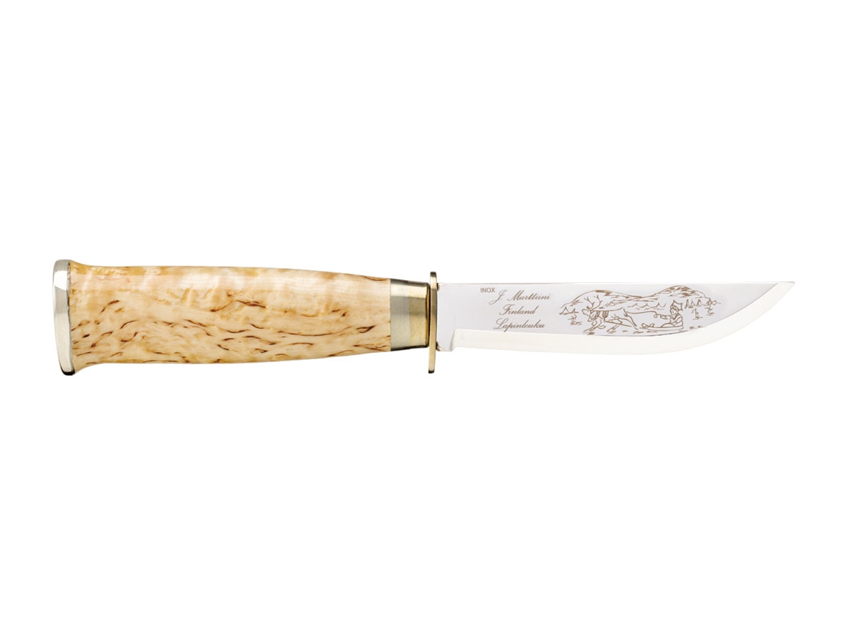 Il Lapp Knife 235 è un coltello tradizionale che include una protezione per le dita e quindi una maggiore sicurezza all'utilizzatore. Questo coltello lappone è un eccellente coltello multiuso, adatto sia per l'outdoor che per la caccia. La lama in acciaio inossidabile cromato e il fodero raffigurano temi tradizionali lapponi. Il fodero è inoltre dotato di una sicura chiusura a scatto.