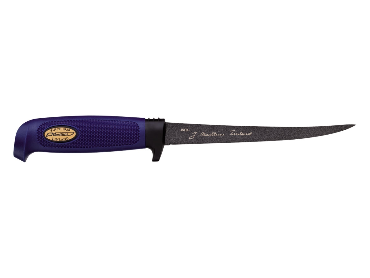 I coltelli da filetto di questa serie hanno la lama rivestita in Martef che le permette di muoversi con estrema fluidità nel pesce, consentendo di ottenere facilmente filetti tagliati in modo netto. Infatti il rivestimento Martef riduce l'attrito quasi a zero, proteggendo anache la lama dalla corrosione. L'impugnatura in gomma testurizzata e la protezione per le dita garantiscono una presa salda anche in condizioni difficili. Questa lunghezza della lama è adatta per la lavorazione di pesci di circa 1 kg.