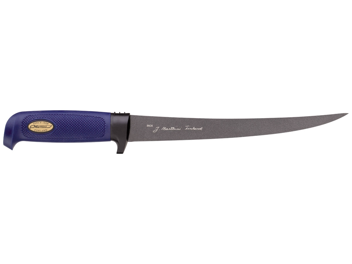 I coltelli da filetto di questa serie hanno la lama rivestita in Martef che le permette di muoversi con estrema fluidità nel pesce, consentendo di ottenere facilmente filetti tagliati in modo netto. Infatti il rivestimento Martef riduce l'attrito quasi a zero, proteggendo anache la lama dalla corrosione. L'impugnatura in gomma testurizzata e la protezione per le dita garantiscono una presa salda anche in condizioni difficili. Questa lunghezza della lama è adatta per la lavorazione dei pesci più grandi.