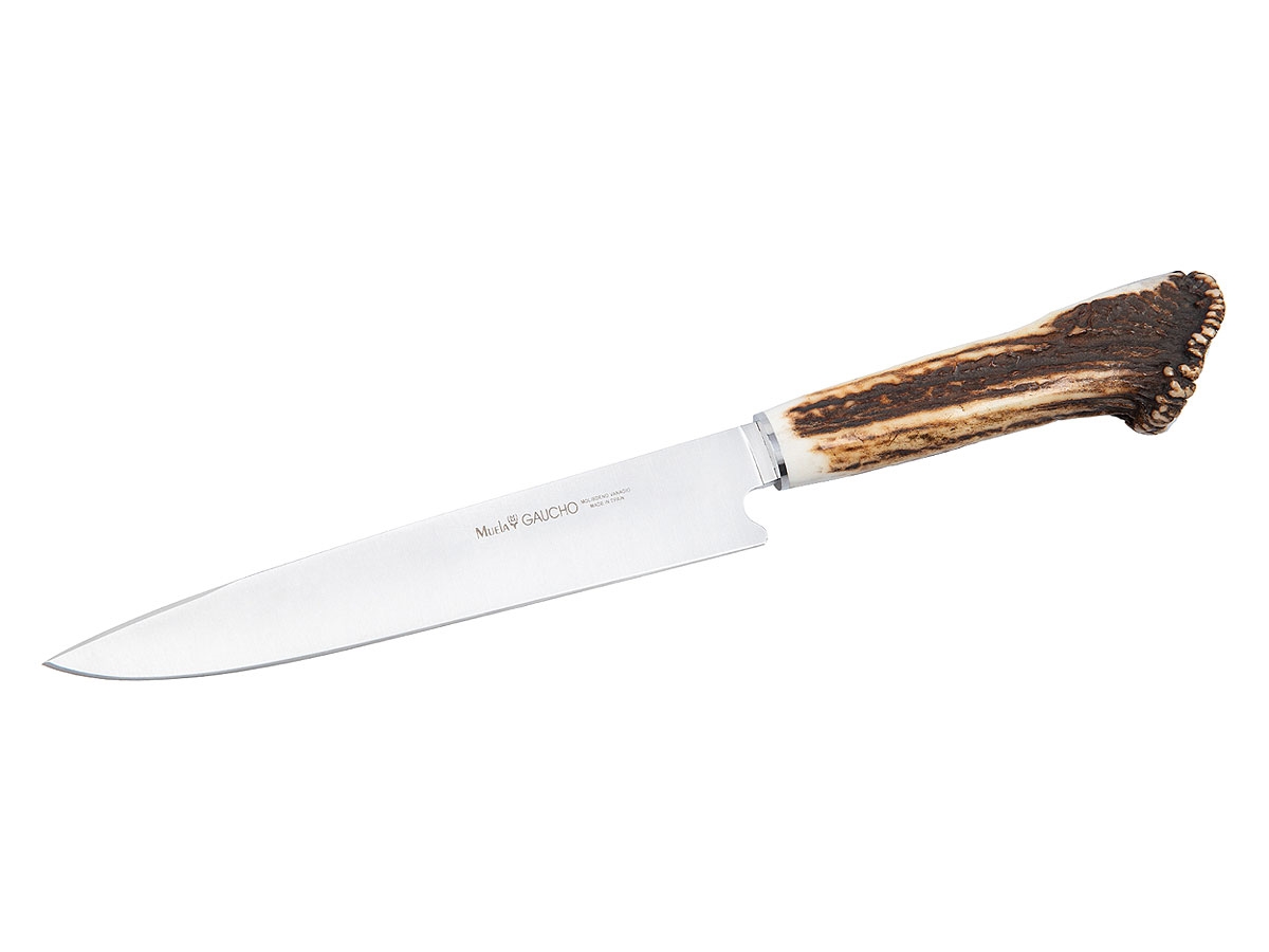 Il nostro coltello con impugnatura in corno di cervo della Desmogue , con finitura a rosetta sormontata dal logo Muela e lama in acciaio MoVa con durezza 57-58 HRC, è uno dei coltelli Muela più richiesti dagli amanti della cucina, dell'arrosto e della grigliatura, per le sue ottime prestazioni nel taglio della carne.