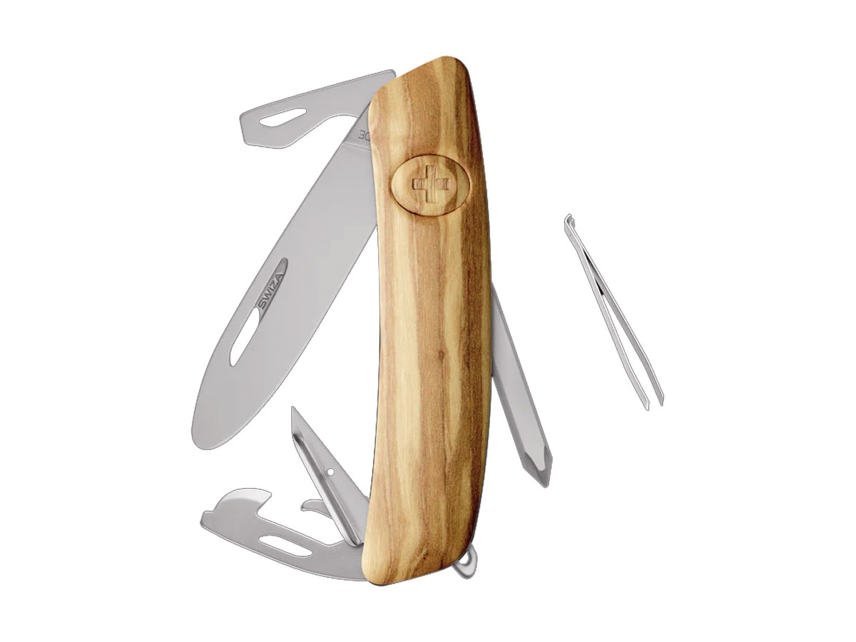 - Finitura satinata opaca di tutte le parti metalliche - Lama con blocco di sicurezza (si sblocca premendo la croce SWIZA) - Lama in acciaio inox 440 con punta tonda di sicurezza - Manico resistente e antigraffio, realizzato in legno di ulivo - Lama e attrezzi con unghiatura per facilitare l'apertura con la mano sinistra o destra