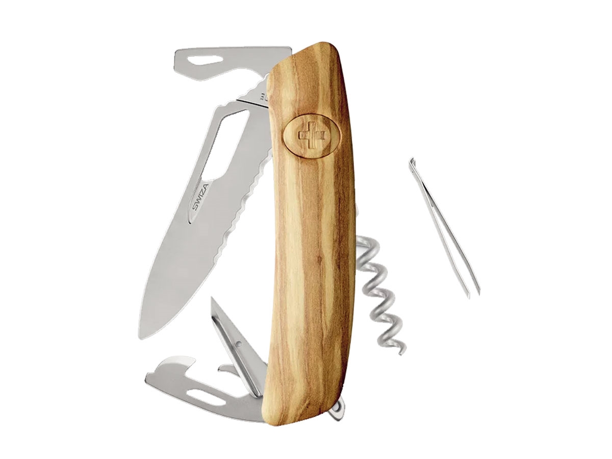- Finitura satinata opaca di tutte le parti metalliche - Lama con filo seghettato, foro (per apertura con una mano) e blocco di sicurezza (si sblocca premendo la croce SWIZA) - Lama in acciaio inox 440 - Manico resistente e antigraffio, realizzato in legno di ulivo - Lama e attrezzi con unghiatura per facilitare l'apertura con la mano sinistra o destra