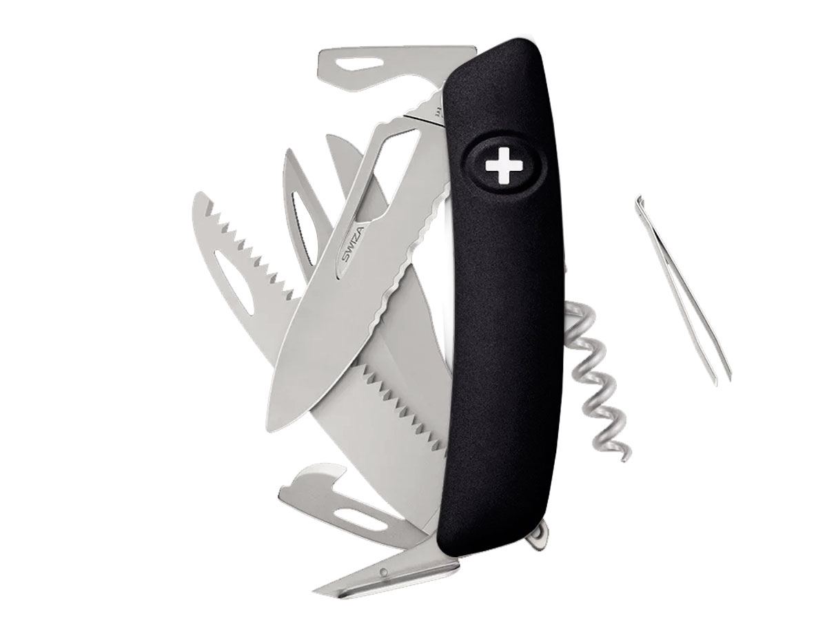 - Finitura satinata opaca di tutte le parti metalliche - Lama con filo seghettato, foro (per apertura con una mano) e blocco di sicurezza (si sblocca premendo la croce SWIZA) - Lama in acciaio inox 440 - Manico resistente e antigraffio, con una confortevole finitura soft-touch - Lama e attrezzi con unghiatura per facilitare l'apertura con la mano sinistra o destra